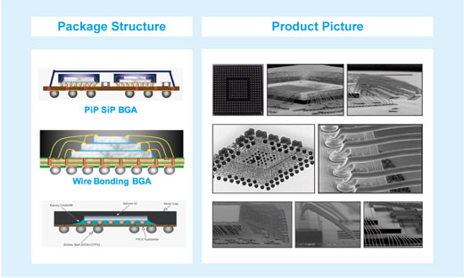 高密度、低弧高(40um)、窄間距(50um)打線(xiàn),Spacer技術(shù),倒裝芯片技術(shù)(突塊高度70um/80um/100um),芯片堆疊,密間距植球技術(shù)(球徑250um,球間距400um)。